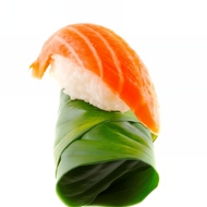 Make indentations in the rice balls and place the salmon slices so that the side with wasabi touches the rice.
