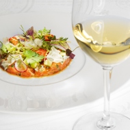 Prepare the avocado mousse: blend one avocado, garlic, shallot, olive oil, simple syrup, and lemon juice in a blender until smooth. Season with salt and pepper to taste, and strain through a chinois.