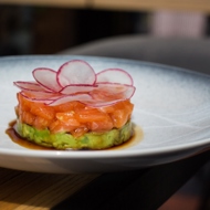 Drizzle the tartare on a bed of avocado with soy sauce and garnish with radish "petals."