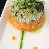 Salmon Tartare with Goat Cheese Cream and Herb Oil Sauce