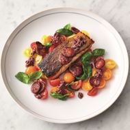 Two minutes before the salmon is done, add the chorizo to the skillet, and 30 seconds later, add the tomatoes. Plate the dish, sprinkle with chopped olives on top, and finish with the remaining basil.
