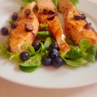 While cooking, carefully flip the steaks, drizzle with honey, sprinkle with oregano (a little, optional), add the blueberries (they should slightly soften); continue flipping until you are sure the fish is cooked.