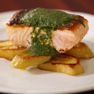 Heat 2 teaspoons of olive oil in a skillet. Cut the salmon fillet into 200-gram pieces and pat dry with a paper towel. Season well with salt and pepper and place in the hot skillet, skin side down. Sear for 5 minutes. Flip the fish and cook for another 1–2 minutes or until done, to your liking.