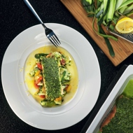 Grease a baking tray with butter, place the skinless salmon fillet on it, seasoning it with salt and pepper beforehand. Spread a thin layer of pesto on the fish, about 2–3 mm thick. Place the baking tray in an oven preheated to 320°F for seventeen minutes.