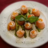 Slice the cold-smoked salmon lengthwise, place Philadelphia cheese at the edge of each piece, and roll the fish into a tube.