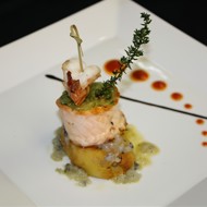 Place the croquettes on a plate, top with salmon, drizzle with cucumber dressing, and add the sautéed shrimp on top. Garnish with balsamic sauce, red pesto, and thyme.