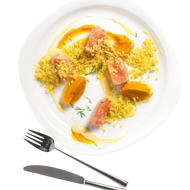 Place the pumpkin puree on the plates, then add the fish, drizzle with sauce, and sprinkle with millet.