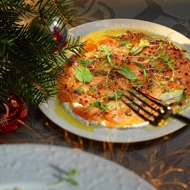 Spread a thin layer of sour cream sauce on the plate, slice the salmon into the thinnest pieces, and arrange them on top of the sauce like carpaccio. Drizzle with a vanilla-butter sauce and serve with salad leaves.