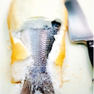 Cover everything with salt, pressing it tightly against the fish. It is essential that the fish is completely covered with salt.