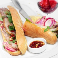Slice the baguettes in half. Toast them in the oven at 356°F for five minutes. Spread mayonnaise on them, then layer with carrots, radish, a bit of pickled onions, meat, and sprinkle with chopped aromatic herbs.