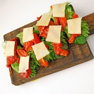 Cut the roasted peppers into large strips, distribute them evenly across the sandwich, and optionally garnish with a few shavings of hard cheese.