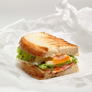 Warm up the bread and spread mayonnaise (you can make it yourself) on one half of the sandwich. On the other half, add cheese, slices of tomato, bacon, and lettuce.