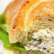Cut the baguettes into halves, then slice each half lengthwise. Spread the salad evenly on all eight pieces, then bring the halves together to form sandwiches, placing a leaf of lettuce in the middle of each.