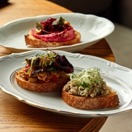 Sandwiches with Eggplant Caviar, Beet Mousse, and Mushroom Caviar