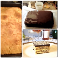 Remove from the oven and flip the cake onto a board. The cooled cake should be covered with chocolate icing or melted chocolate. To prepare the icing: mix 1 cup of sugar with an egg, cocoa powder, butter, and milk. Place over low heat, warm, and cook for 5 minutes. Immediately pour over the cake and decorate (with nuts, candied fruits, micro-meringues, pieces of nougat, or whatever you like).