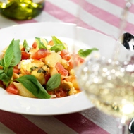Pour the wine into the pan, cover it and let it sit for a couple of minutes, then allow the wine to evaporate. Add the al dente pasta (shells), chopped tomatoes, a small pinch of sugar, and a couple of basil leaves — you can remove the basil later and garnish the dish with fresh leaves when serving.