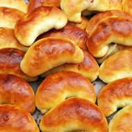 After that, roll out the dough to a thickness of ½ cm, cut out circles using a glass or a special cutter; brush the top of the dough circle with beaten egg, place filling in the center, and shape the pastries into various forms.