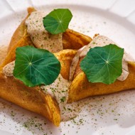 In the center of each pancake, add a little mushroom sauce, fold it up, brush the edges with egg, and arrange them in a cross. The pancake samosa is ready!