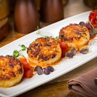 Fry the patties in a skillet until golden brown, then finish cooking in the oven at 356°F for seven to eight minutes. Heat the sauce and add diced tomatoes. On a plate, first layer the sauce, then place the patties on top of the sauce. Garnish with herbs and black salt.