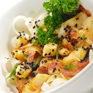 Place the ingredients in a salad bowl: first the pasta, then the scallops, eggs, and vegetables, sour cream, pepper, and spices to taste, mixing everything thoroughly. Garnish the salad with parsley or basil sprigs, chopped chives, and sprinkle with sesame seeds.