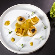 Place the scallop on a plate, drizzle with melon sauce and garnish with melon. Top it off with black caviar and basil oil.