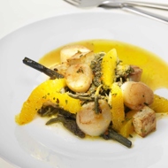 Add the remaining olive oil, orange segments, and onion to the warm sauce, followed by the celery, scallops, and fern. Gently mix and plate the dish.