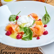 In a large deep plate, place the hot spinach parmentier, top with 3 rolls of marinated salmon, two halves of poached egg, and garnish with beet sauce, dried tomatoes, spinach, and radish.