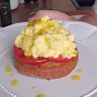When the eggs are just set but not fully cooked, the scramble is ready. Transfer it onto the brioche with tomatoes, drizzle with spicy oil and onions, and serve immediately.