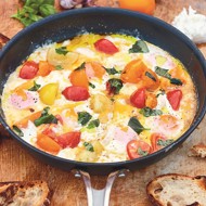 This recipe is taken from a popular cooking book. "This is a fantastic appetizer and a great breakfast! It’s incredibly easy to make: just throw everything in a skillet, and it’s ready to serve. The melted mozzarella blends with the tomatoes, making the eggs taste extraordinarily delicious. You’re going to love it!"