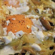 Crumble pieces of feta cheese into the frying pan. Optionally, feta can be added to the finished dish. Cook for a few minutes until the desired consistency of the eggs is reached. Serve immediately.