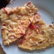 Crack the eggs into the skillet and stir everything until well combined. Wait for a minute. Flip (it’s unlikely that you will be able to flip the entire omelet at once. That’s okay, flip it in parts).