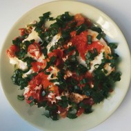 Then crack the eggs over the tomatoes and fry until cooked through.