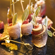 Pierce each roll with a skewer, garnish with fresh sage leaves (instead of the baked ones that can be removed from the rolls), and drizzle a little passion fruit pulp on top. Serve alongside figs, which should also be skewered for convenience.