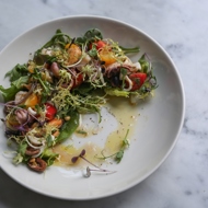 Light due to the abundance of salad greens and yet hearty because of the plethora of seafood, this salad hails from Liguria and could easily stand in as a full hot dish. It includes octopus, squid, mussels, and shrimp — the list can go on and be varied. To complete the flavor profile, anchovies are added to the dressing, while pine nuts and basil are included in the salad (it's worth recalling the pesto sauce with the same ingredients, as it too is of Ligurian origin). Recipe by John Smith, chef at a local American restaurant.