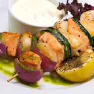 Grill the skewers, basting with marinade, for 6-7 minutes on each side until cooked through.