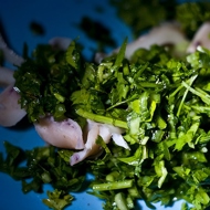 Finely chop a good bunch of green onions and parsley, drizzle with oil, mix, and add to the squid.