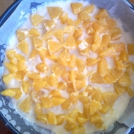 Line a baking dish with parchment paper, pour in 1/3 of the batter, spread it across the bottom, place the oranges on top, and pour the remaining batter over them. Bake for about 30–40 minutes, checking for doneness.