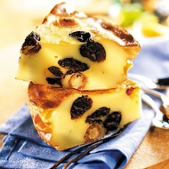 Layer the dish: polenta, prunes, polenta, apricots, and top layer - polenta. Cool, cut into triangles, and dip in almonds.