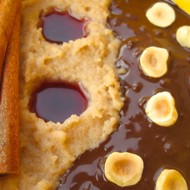 Serve the porridge generously drizzled with sauce, hot chocolate, and garnished with hazelnut kernels.