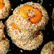 Shape a ball from the nut-fruit mixture by hand, roll it in sesame seeds, and garnish with cashew nuts.
