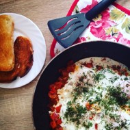 Now comes the moment of truth — crack the eggs into the shakshuka! You don't need to make indentations with a spoon — just crack the eggs, placing four around the edge of the skillet and one in the center. The yolks should remain intact.