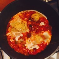 Make small indentations with a spoon and crack the eggs into them. Cover with a lid. Keep on heat until the eggs are fully cooked (about 8 minutes).