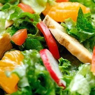 In a salad bowl, mix the two types of lettuce, chopped tomato, radish, and a few pieces of carrot.