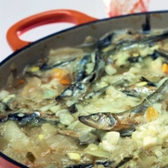 Soak the fish fillets in water for one to two hours. Then, mix them in a pot with sauerkraut and diced turnips, and add finely chopped onions. Pour in enough water so that the contents of the pot are quite thick — enough for a spoon to stand upright.