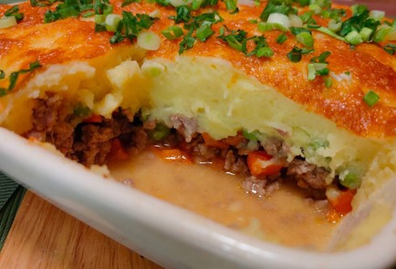Hearty, quick, and delicious. The filling can be any type of ground meat, but it's best to use beef or a mix of beef and pork. The peas can also be fresh or frozen. Adjust the amount of salt in the filling to taste; the potatoes should not be overly salted. It can be served with sour cream.
