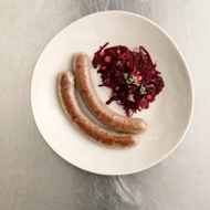 At the very end, add a few sprigs of thyme, diced apple, and finely chopped green onions. Serve with fried sausages.