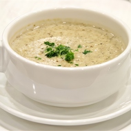 Pour a small amount of the mixture into the center of the soup and top with some dried mushrooms.