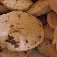 Remove the dough from the refrigerator and cut it into circles about 5–7 mm thick. Place them on a baking sheet lined with parchment paper. The cookies can be placed fairly close together as they do not spread or increase in volume during baking. Bake for 7–15 minutes until lightly browned.