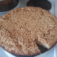 On top of the dough, spread a layer of jam and carefully smooth it out with a spoon. Take the smaller part of the dough from the freezer and grate it over the jam using a coarse grater.