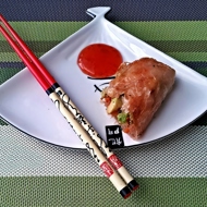 Take a rice paper sheet, quickly dip it in the water, place it on the table, and carefully lay the noodle-vegetable mixture on the edge of the sheet, followed by a few shrimp and avocado slices (leave margins on all sides of the rice paper). Carefully fold the remaining side edges first, then the top edge, and begin to roll up the filling, ensuring nothing spills out and the sheet does not tear. Once rolled, wrap it in another rice paper sheet. Each roll will require 2 rice paper sheets.